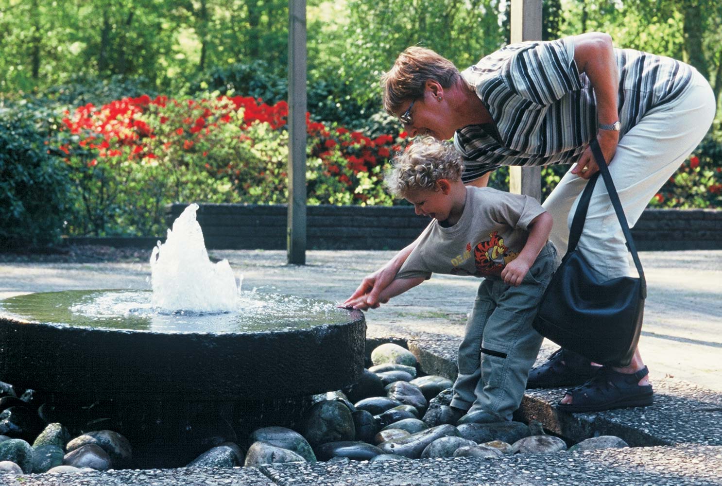 Verscholen tussen de rododendrons, op een iets verhoogd terras, springt een fonteintje op uit het midden van een kleine molensteen.