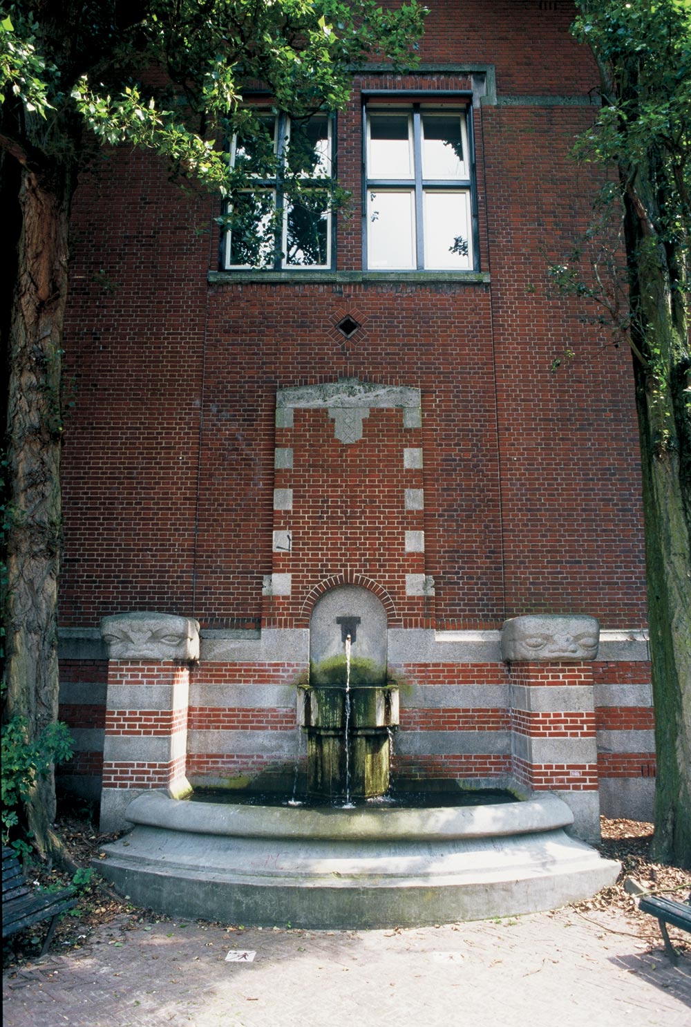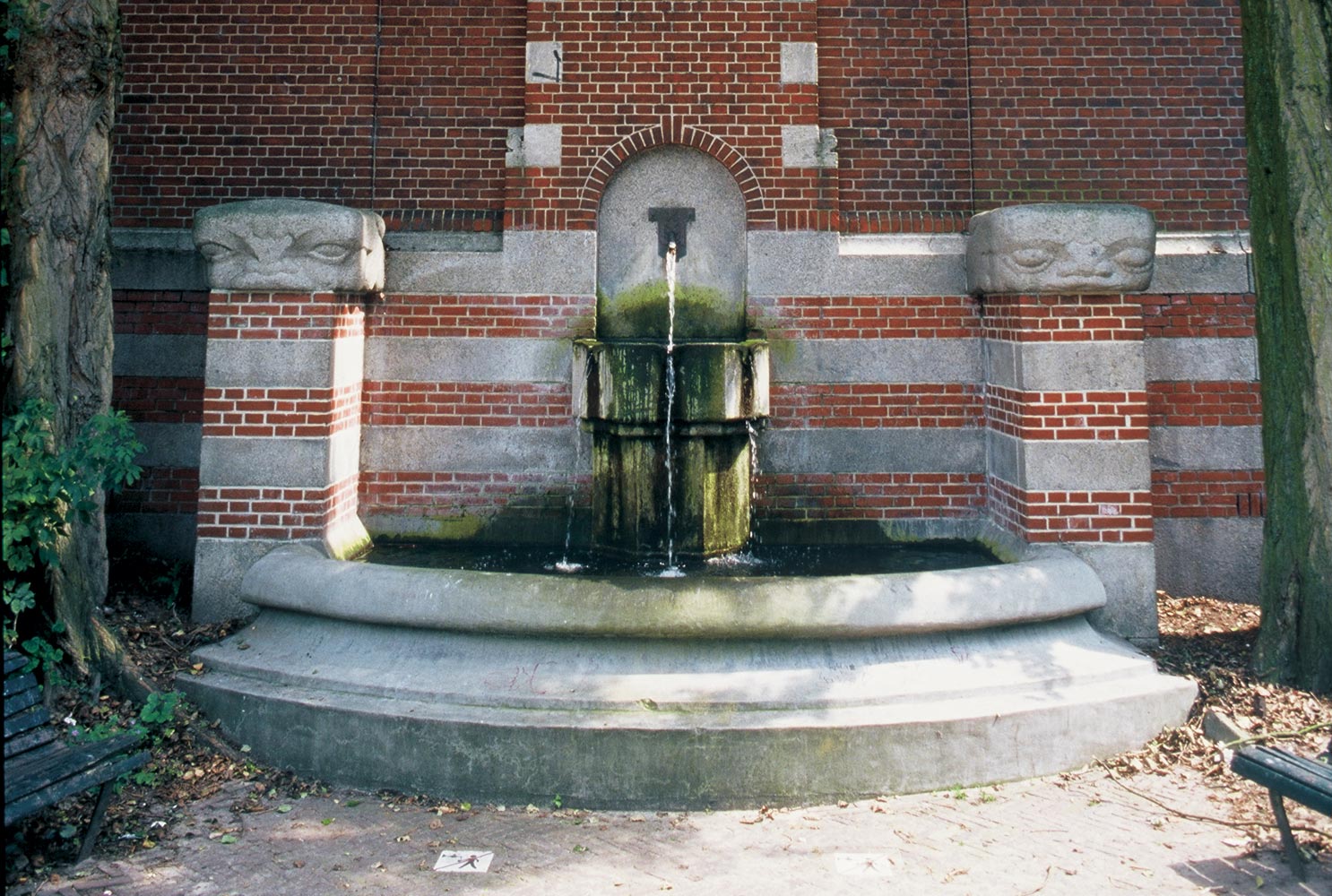 Het gebouw met de muurfontein is omstreeks 1920 ontworpen door bouwkundige Abel Antoon Kok, toen in dienst van Publieke Werken. A.A. Kok heeft veel betekend voor Amsterdam door zijn strijd voor het behoud van de "Historische Schoonheid" in de binnenstad en de deskundige wijze waarop hij restauraties verrichtte. Als secretaris van Bond Heemschut (vereniging tot bescherming van cultuurmonumenten in Nederland) van 1923 tot 1946 en redacteur van dat blad, kwam Kok veel te weten over oude panden. Hij was altijd bezig oude bouwkundige tekeningen en prenten te bemachtigen op veilingen en vond het een “leerzame sport uit te zoeken wat ze voorstelden en van welke architect ze waren”. Hij was een fanatiek verzamelaar. Zijn verzameling, de 'Atlas van Kok', bevat Amsterdamse kaarten, tekeningen, bouwtekeningen, prenten, foto's en prentbriefkaarten over een periode van drie eeuwen.