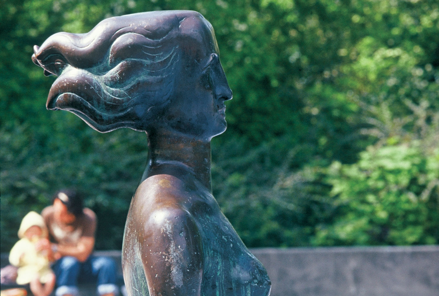 In de luwte van hoge bomen, omringd door een pergola, ligt de wijde cirkel van een speelvijver. Het water schittert in het zonlicht. Een net van witte flitsen ketst op de blauwe tegelbodem van het ondiepe bad. Op de rand van het bassin staat een bronzen beeldengroep op een stenen sokkel. Een zeemeermin giet water uit een schelp, de schubben glanzen groen op haar gebogen staart. Twee grote lachebekkende vissen dartelen aan haar zijde.