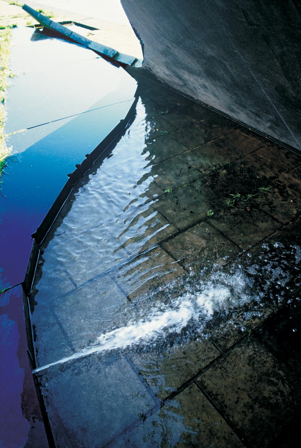 Een straal water scheert langs de bodem van het ondiepe bassin en bedekt de tegelvloer met een transparant kleed van zuurstofbelletjes.