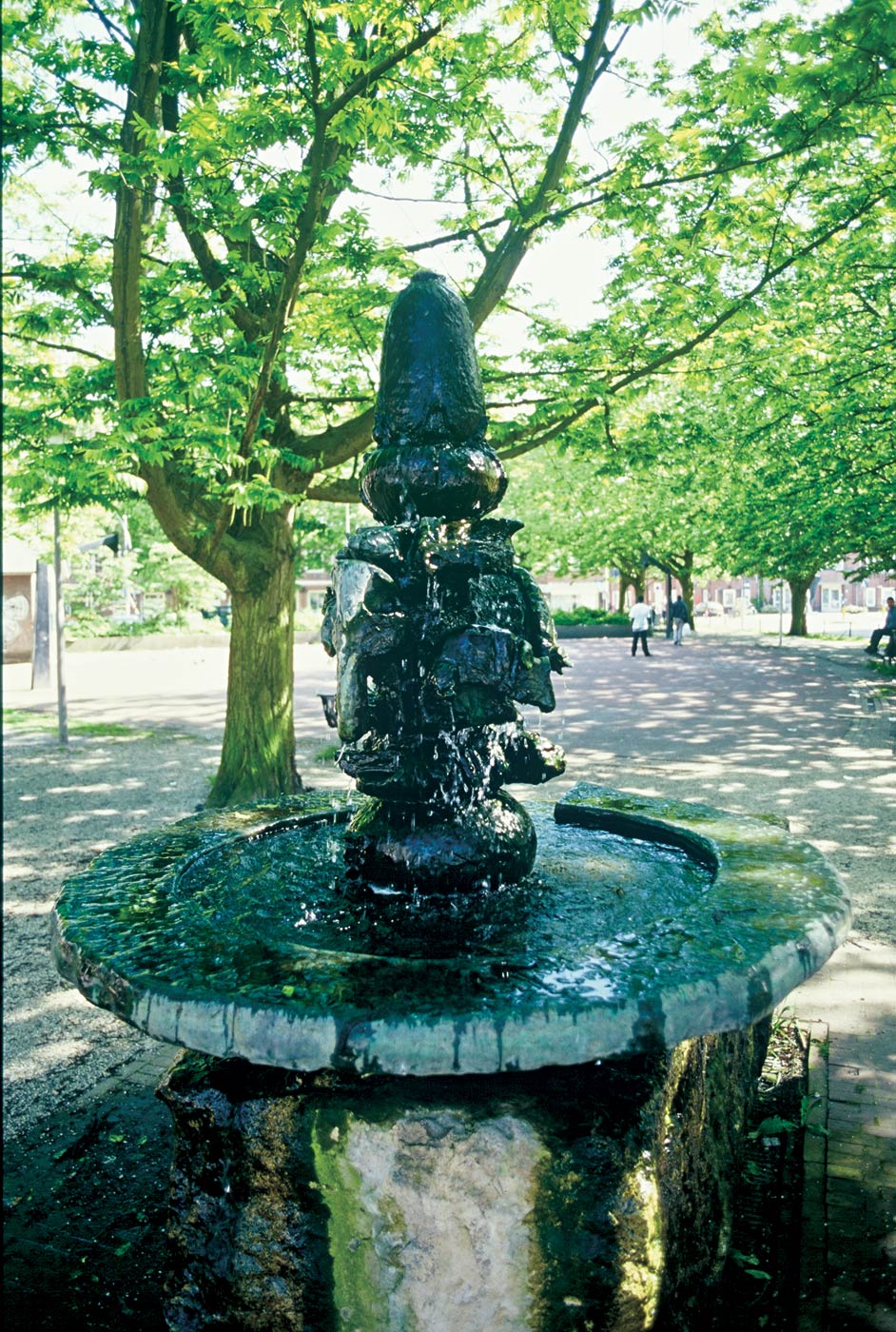 Uit de ronde top van de watersculptuur stroomt water langs duistere vormen naar beneden in de schaal. De koele stroom valt over de rand van de kom, spat op het voetstuk en glijdt ritselend langs ribbels en door gootjes naar de roosters op de grond. In de schaduw van de groene bomen flonkert de donkere toren geheimzinnig onder het bewegende water. Allerlei plantaardige en dierlijke vormen lichten op. Wie de toren goed bekijkt kan varkens, slangenkoppen en hagedissen ontdekken en misschien zelfs de contouren van voorwereldlijke planten en dieren.