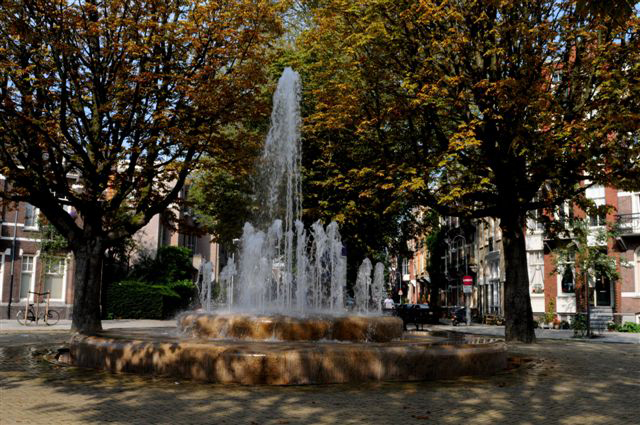 De fontein, kastanjebomen, grachtenlantaarns en een loungebank geven het Hogewegplein allure.