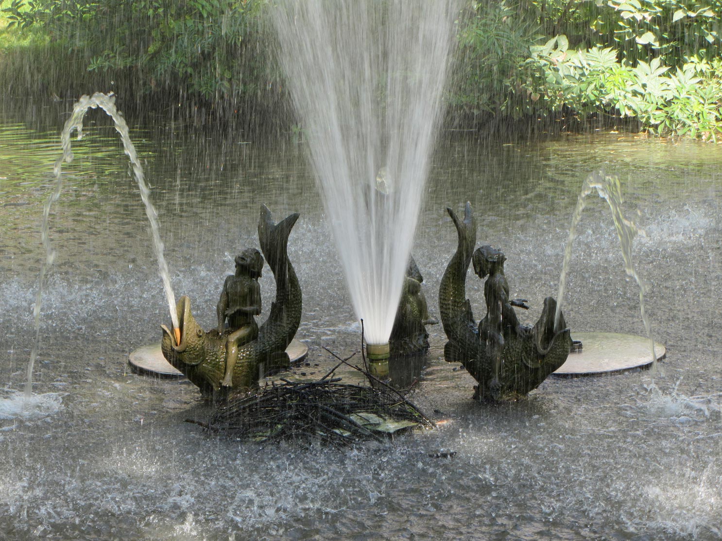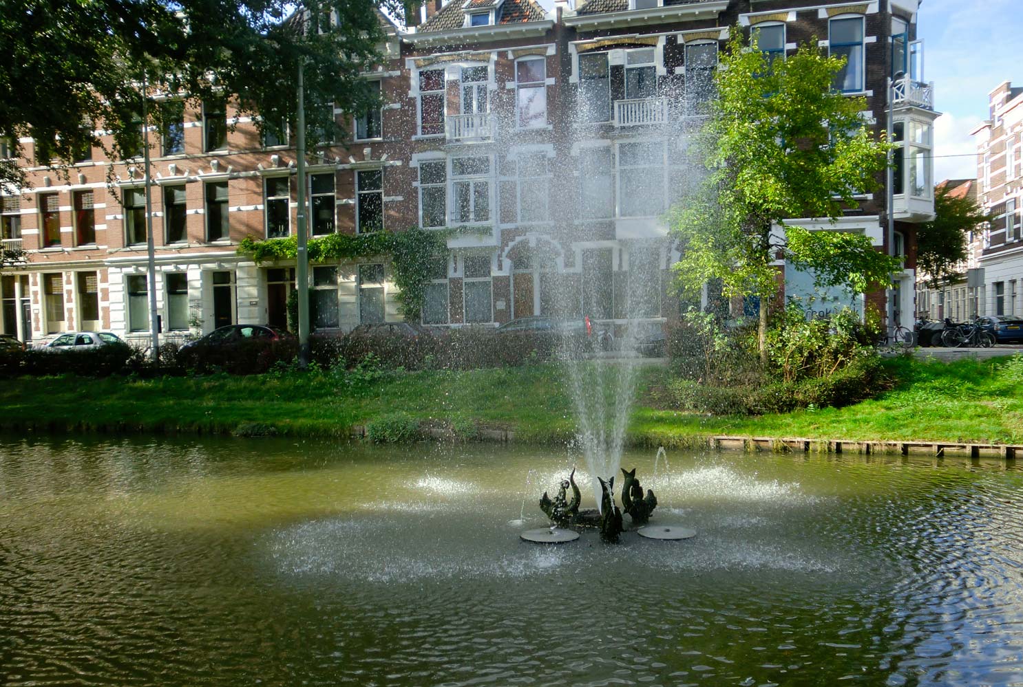 Uit het water van de singel springen drie sierlijke vissen op rond een hoge fontein. De drie kinderen op de ruggen van de dartele vissen laten hun gezichtjes nat sproeien door de fijne stralen van de fontein in hun midden.