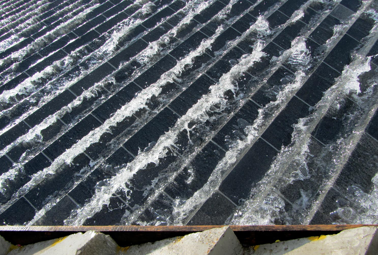 Het water stort wit en bruisend langs de treden van de trap naar beneden