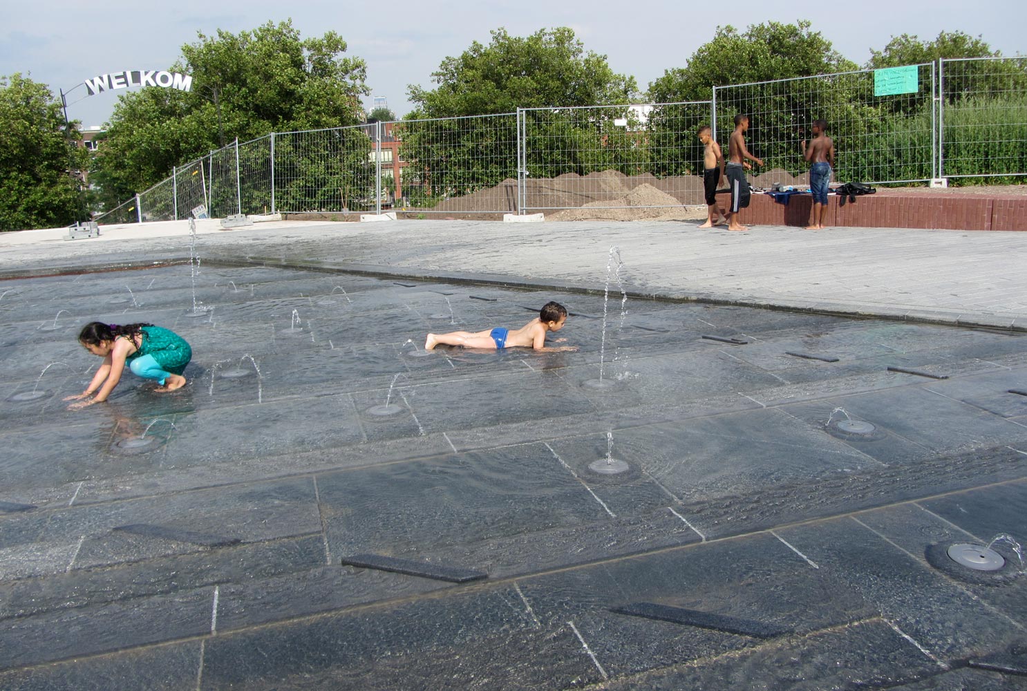 Afmetingen: natuurstenen waterplateau met 53 spuiters, 40 x 10 meter.
