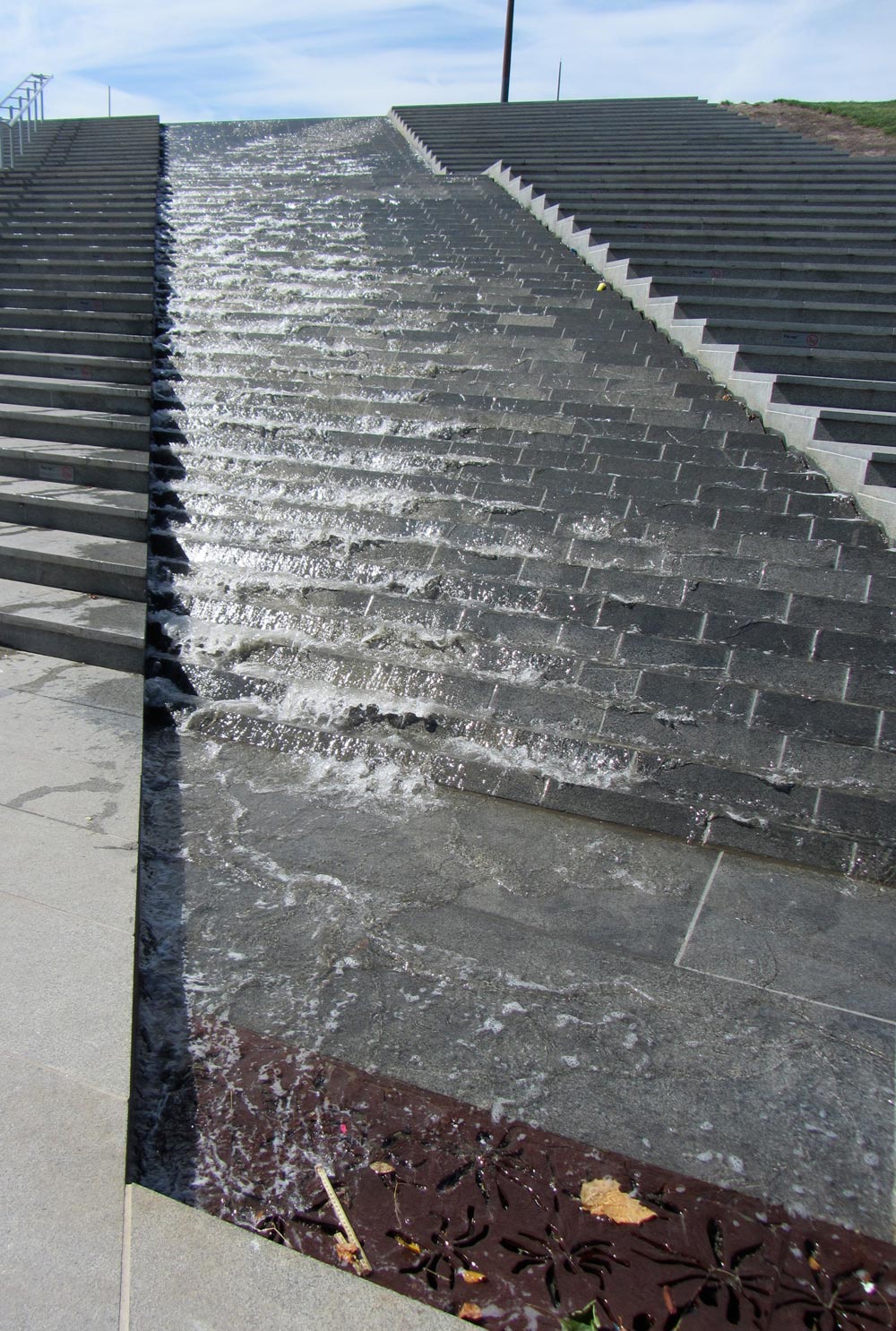 De 53 fonteinen springen speels en onverwachts op uit het plateau. De waterbogen lijken naar elkaar te buigen of verdwijnen even helemaal. Het water stroomt over het plateau naar de trap en stort zich wit en bruisend langs de treden maar beneden om in de versierde roosters te verdwijnen.