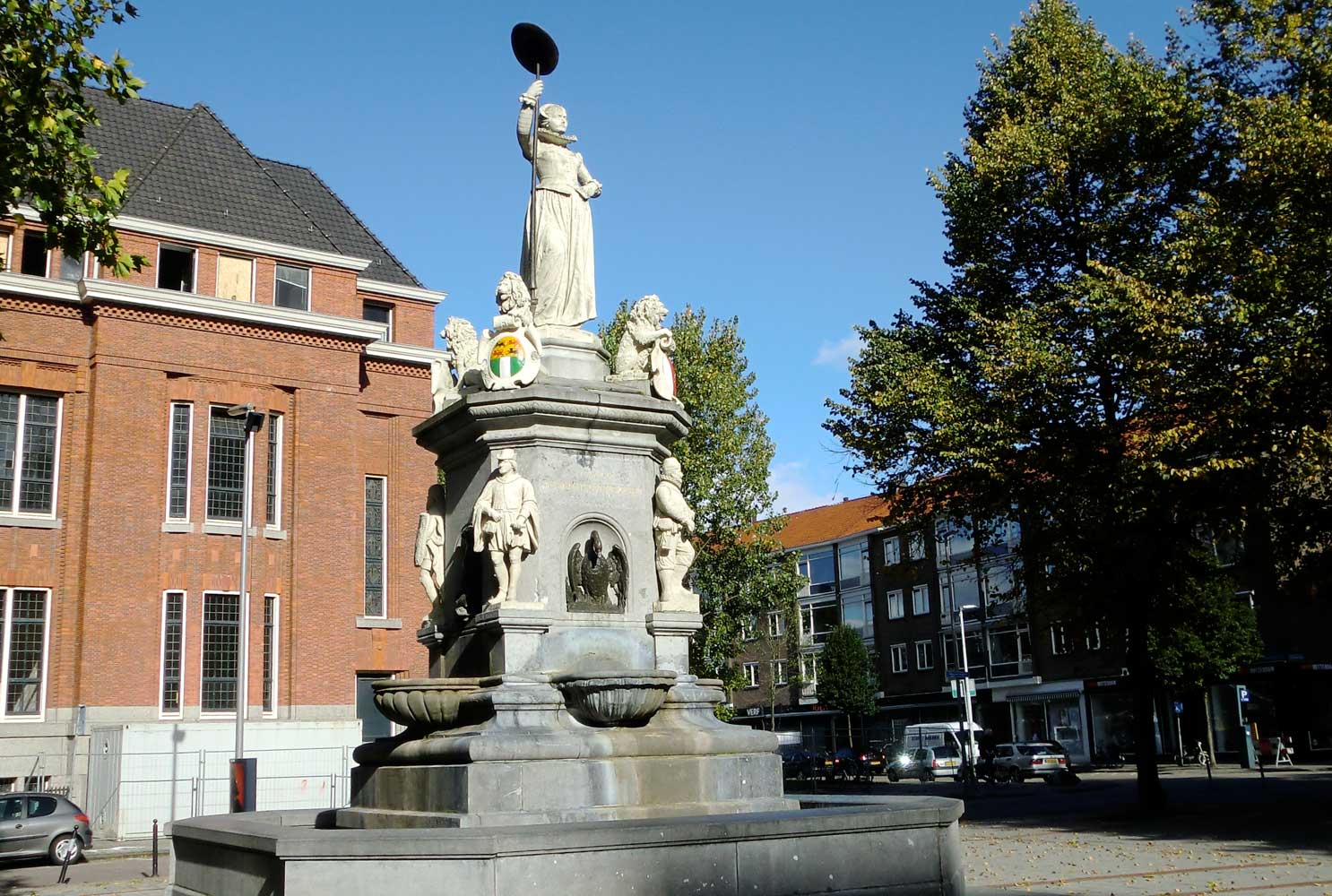 De monumentale fontein is opgebouwd uit drie delen: in het acht-hoekige bassin staat een voetstuk dat het beeld van de Maagd van Hollend draagt. Zij heeft een speer met vrijheidshoed n de hand en symboliseert de bevrijding van den Briel. Op 1 april 1572 bevrijdden de Watergeuzen de stad van de Spanjaarden, "den Briel ontrukt aan Spanje, behouden voor Oranje " meldt een van de opschriften.