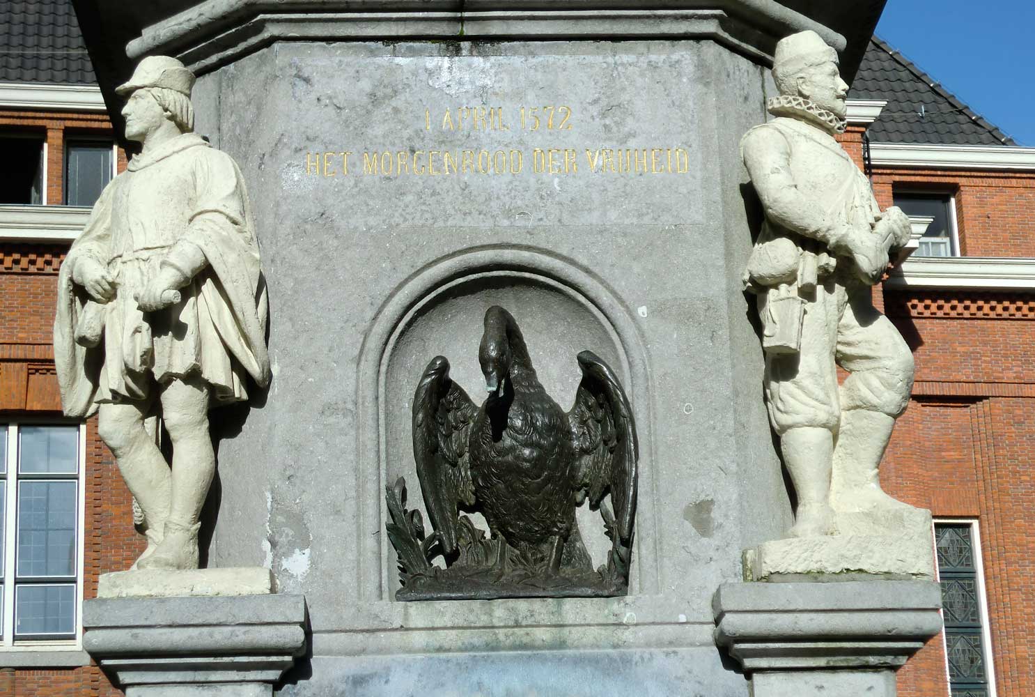 In 1872, driehonderd jaar na de bevrijding van den Briel, vierden de Rotterdammers een groot feest met een optocht. De vier beelden die op de hoeken van het voerstuk staan, zijn historische figuren die meeliepen in de optocht: een Watergeus die verwijst naar 1572, een werkman met hamer en tandrad (het eerste beeld in Nederland dat een werkman voorstelt), een Batavier met knots en een middeleeuwse poorter met vrijbrief.