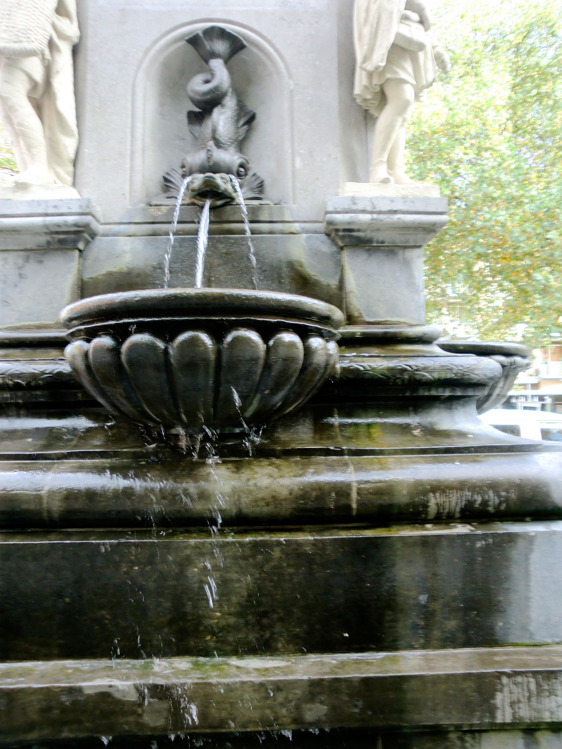 Tussen de beelden spuwen twee zwanen en twee vissen een waterstraal in schelpvormige kommen die overlopen in het bassin.