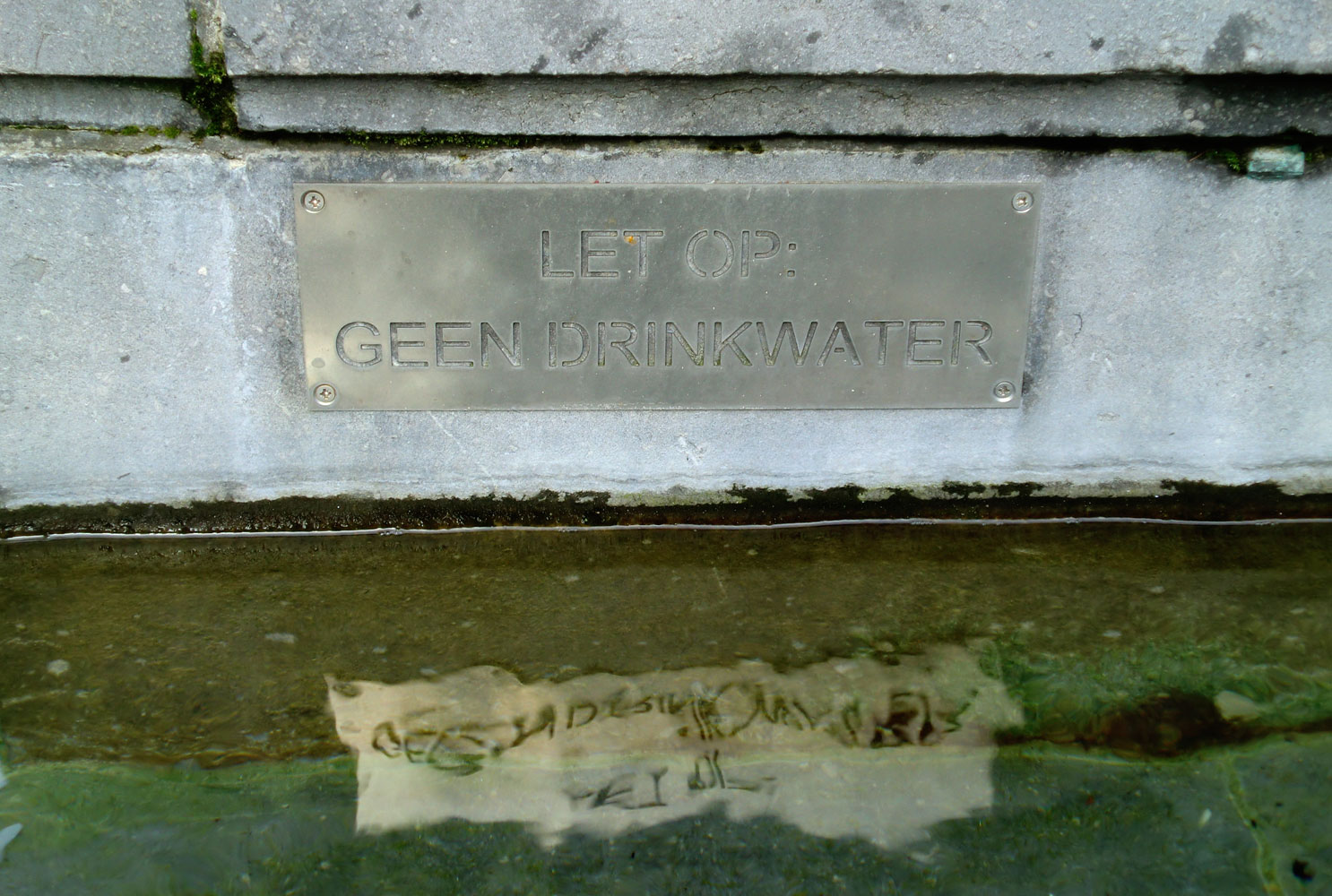 Vlak boven de waterspiegel staat nu op elke zijkant van de sokkel: "Geen drinkwater".