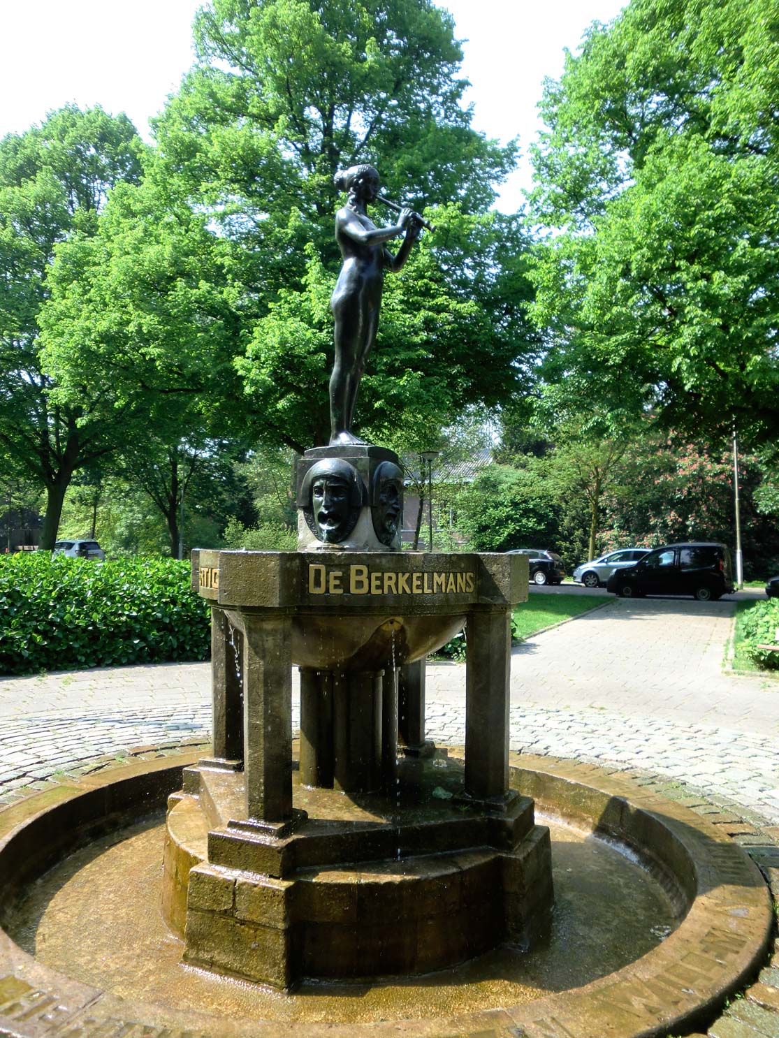 De sokkel is versierd met vier maskers die een straal water spuwen in de schaal
