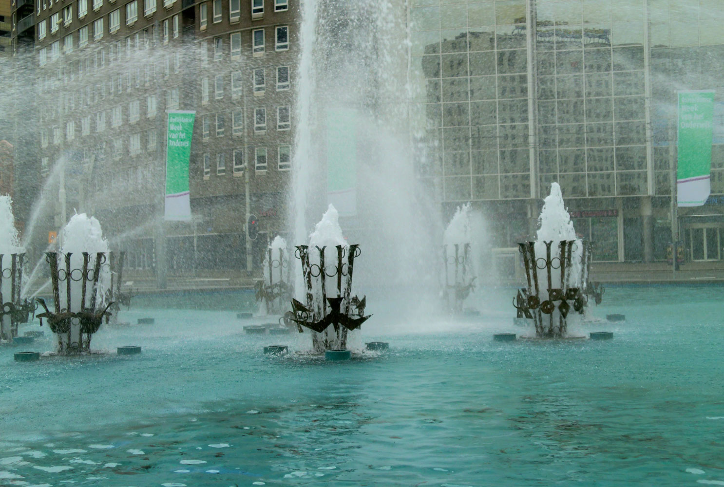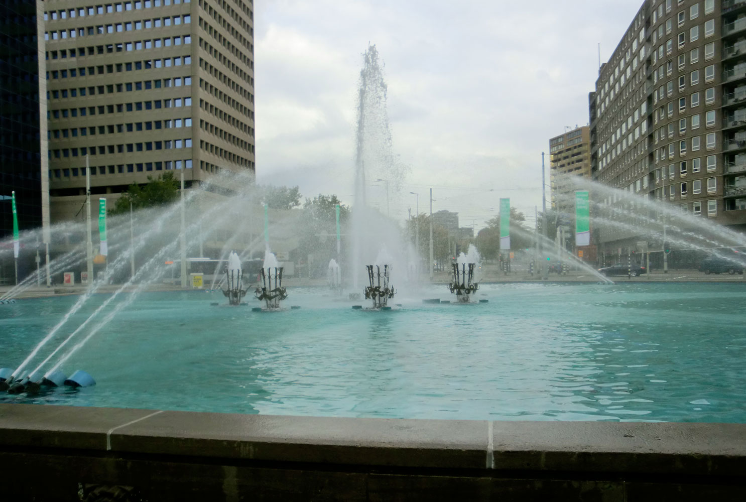 In het grote waterbekken lopen, schuin naar beneden, acht ribben die ook dienst doen als goten voor de waterafvoer. Gestileerde waterlelies, waaruit water sproeit, staan in een kring om de hoog opspringende waterkolommen in het midden. Vanuit de acht hoeken sproeien waterstralen schuin omhoog naar het midden.