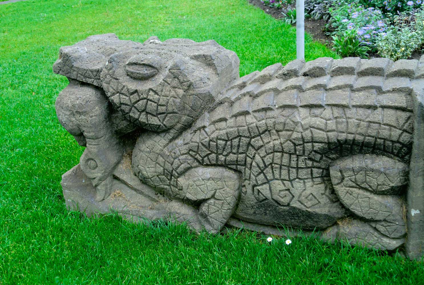 Beeldhouwer Van Kralingen zette acht waterdieren in het gras bij de acht hoeken van het bassin. Krokodillen, vissen en slangen.