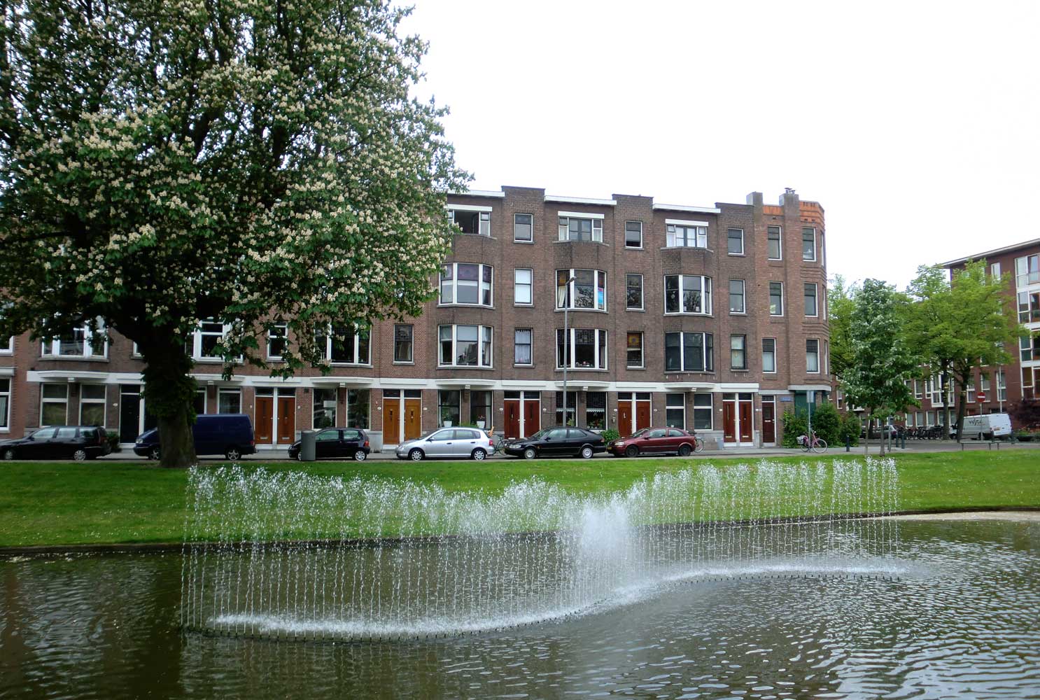 Drie fonteinen in de vorm van een Sinusgolf, rijen fonteinen vormen een speelse S