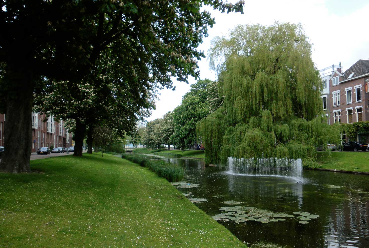 Drie Sinusgolf fonteinen op palen (Sinusgolf, de simpelste golfvorm bestaande uit een grondtoon zonder boventoon). Drie drijvende fonteinen met rechte spuitmond.