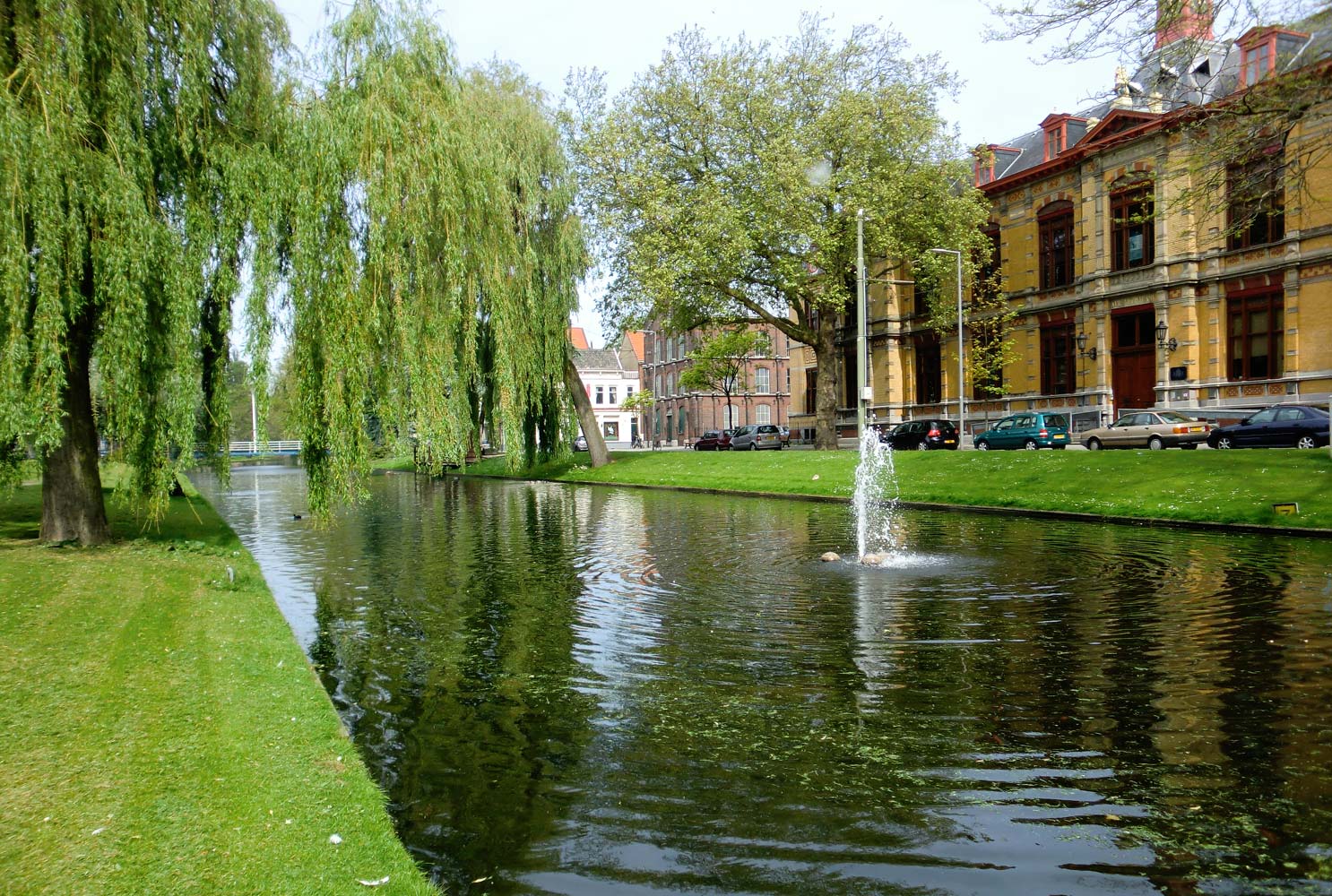 Twee fonteinen springen op uit het water. Langs de singel groene bermen, treurwilgen en kastanjebomen.