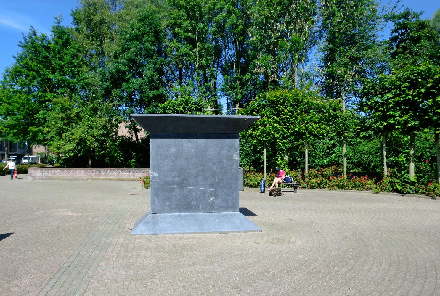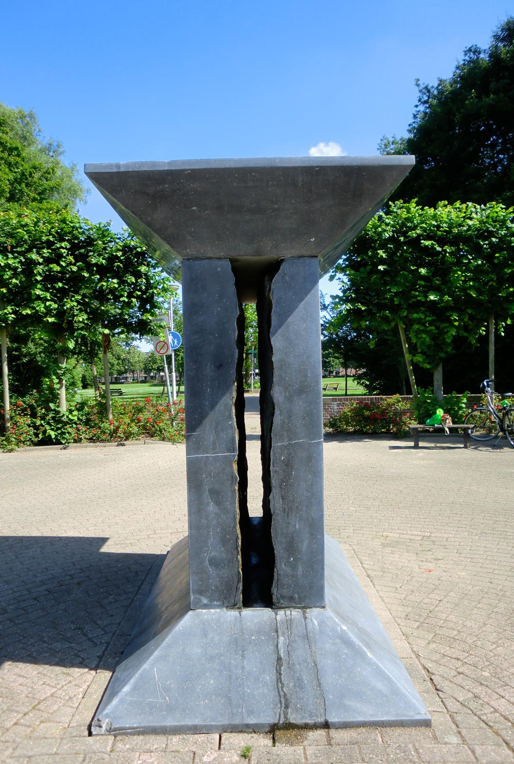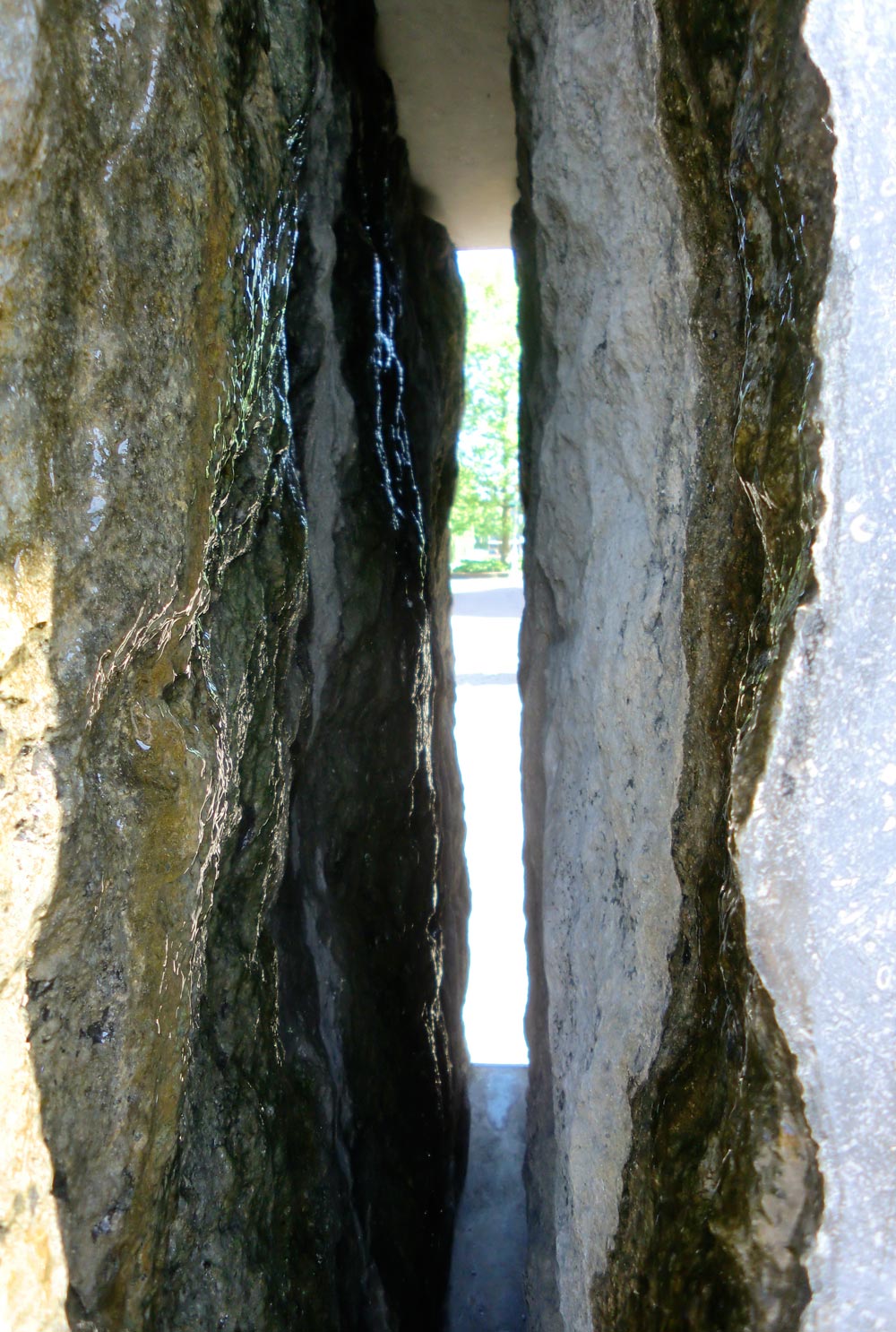 Hans van Lunteren noemt zijn watersculptuur Binnenstebuitenbeeld: het ruwe oppervlak van de hardsteen zit aan de binnenkant van het beeld. Langs deze natuurlijk gevormde ruwe binnenkant sijpelt water waardoor een ideaal klimaat ontstaat voor mosjes en varentjes om daar te laten groeien. De buitenkant is glad gepolijst.