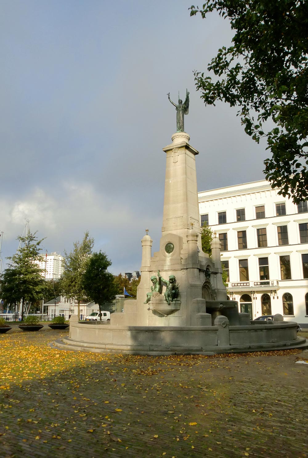 De watersculptuur stond oorspronkelijk in het hart van het nieuwe centrum van Rotterdam, op de kop van de Coolsingel. De fontein werd in 1939 verplaatst naar de Veerkade omdat het in de weg stond van het doorgaande verkeer.